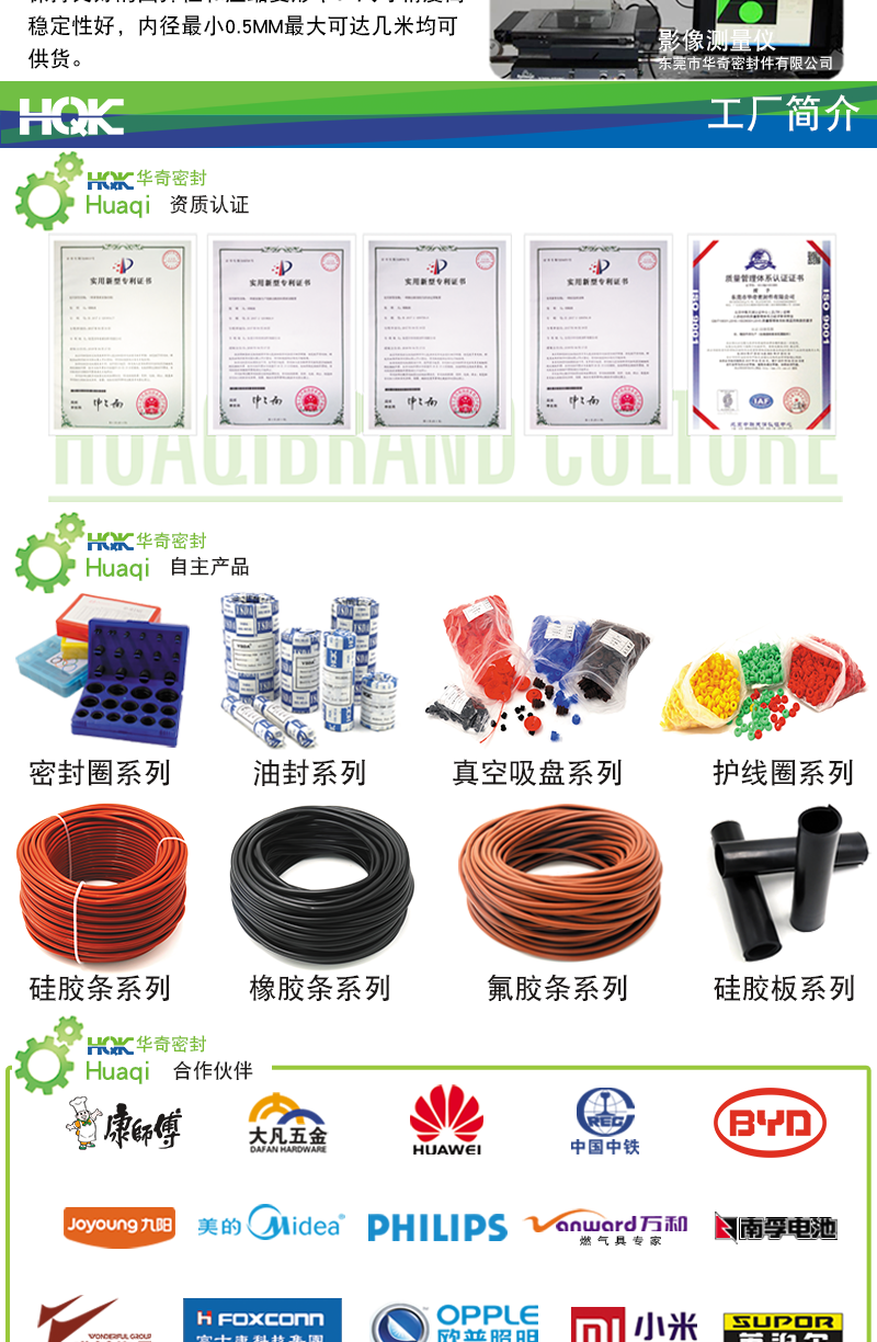 東莞市華奇密封件有限公司成立于2006年,位于廣東省東莞市石碣鎮(zhèn),占地面積10000平方米,公司員工150余人,是廣東省集橡膠硅膠硫化、橡膠擠出、硅膠擠出一體化生產(chǎn)的新型企業(yè)。 本公司主營(yíng)產(chǎn)品有:大型盾構(gòu)機(jī)密封圈,充氣密封圈,烤箱密封圈,密封條,真空吸盤,密封圈O型圈,密封圈護(hù)線圈,金屬包膠等非標(biāo)定制硅橡膠制品。 東莞市華奇密封件有限公司材料庫擁有超過數(shù)百種獨(dú)特的配方,并擁有在嚴(yán)苛環(huán)境下,如極端溫度、介質(zhì)侵蝕、超高壓力時(shí)也具有優(yōu)良的密封材料。高性能橡膠、硅膠原材料、全自動(dòng)生產(chǎn)設(shè)備及先進(jìn)的檢驗(yàn)設(shè)備,為制造高質(zhì)量的橡膠零件提供了強(qiáng)有力的保障。公司采用先進(jìn)的管理理念,引進(jìn)精良的工藝裝備和高素質(zhì)的員工隊(duì)伍,在多年的工作過程中,把嚴(yán)格的品質(zhì)落實(shí)在生產(chǎn)流程的每一個(gè)細(xì)節(jié)中,嚴(yán)格執(zhí)行行業(yè)標(biāo)準(zhǔn),規(guī)范操作,用科學(xué)嚴(yán)謹(jǐn)?shù)墓ぷ鲬B(tài)度確保華奇每一件產(chǎn)品精準(zhǔn)可靠。產(chǎn)品暢銷全國(guó)近三十多個(gè)省、市自治區(qū)及遠(yuǎn)銷國(guó)外。竭誠(chéng)與國(guó)內(nèi)外商家雙贏合作,共同發(fā)展,共創(chuàng)輝煌!