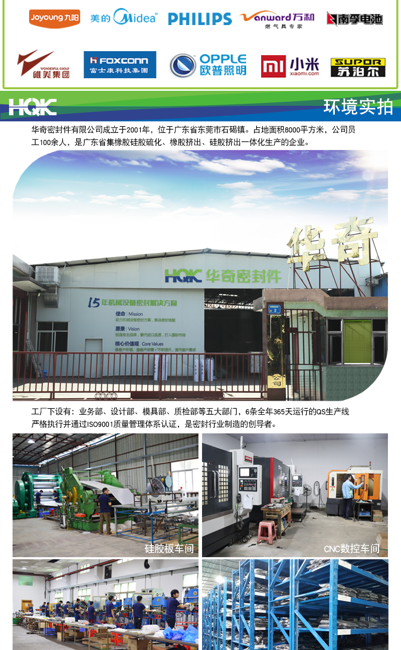 東莞市華奇密封件有限公司成立于2006年,位于廣東省東莞市石碣鎮(zhèn),占地面積10000平方米,公司員工150余人,是廣東省集橡膠硅膠硫化、橡膠擠出、硅膠擠出一體化生產(chǎn)的新型企業(yè)。 本公司主營產(chǎn)品有:大型盾構(gòu)機(jī)密封圈,充氣密封圈,烤箱密封圈,密封條,真空吸盤,密封圈O型圈,密封圈護(hù)線圈,金屬包膠等非標(biāo)定制硅橡膠制品。 東莞市華奇密封件有限公司材料庫擁有超過數(shù)百種獨特的配方,并擁有在嚴(yán)苛環(huán)境下,如極端溫度、介質(zhì)侵蝕、超高壓力時也具有優(yōu)良的密封材料。高性能橡膠、硅膠原材料、全自動生產(chǎn)設(shè)備及先進(jìn)的檢驗設(shè)備,為制造高質(zhì)量的橡膠零件提供了強(qiáng)有力的保障。公司采用先進(jìn)的管理理念,引進(jìn)精良的工藝裝備和高素質(zhì)的員工隊伍,在多年的工作過程中,把嚴(yán)格的品質(zhì)落實在生產(chǎn)流程的每一個細(xì)節(jié)中,嚴(yán)格執(zhí)行行業(yè)標(biāo)準(zhǔn),規(guī)范操作,用科學(xué)嚴(yán)謹(jǐn)?shù)墓ぷ鲬B(tài)度確保華奇每一件產(chǎn)品精準(zhǔn)可靠。產(chǎn)品暢銷全國近三十多個省、市自治區(qū)及遠(yuǎn)銷國外。竭誠與國內(nèi)外商家雙贏合作,共同發(fā)展,共創(chuàng)輝煌!