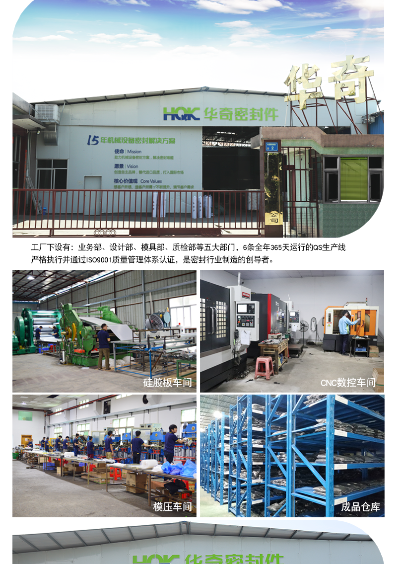 東莞市華奇密封件有限公司成立于2006年,位于廣東省東莞市石碣鎮(zhèn),占地面積10000平方米,公司員工150余人,是廣東省集橡膠硅膠硫化、橡膠擠出、硅膠擠出一體化生產(chǎn)的新型企業(yè)。 本公司主營產(chǎn)品有:大型盾構(gòu)機(jī)密封圈,充氣密封圈,烤箱密封圈,密封條,真空吸盤,密封圈O型圈,密封圈護(hù)線圈,金屬包膠等非標(biāo)定制硅橡膠制品。 東莞市華奇密封件有限公司材料庫擁有超過數(shù)百種獨(dú)特的配方,并擁有在嚴(yán)苛環(huán)境下,如極端溫度、介質(zhì)侵蝕、超高壓力時(shí)也具有優(yōu)良的密封材料。高性能橡膠、硅膠原材料、全自動(dòng)生產(chǎn)設(shè)備及先進(jìn)的檢驗(yàn)設(shè)備,為制造高質(zhì)量的橡膠零件提供了強(qiáng)有力的保障。公司采用先進(jìn)的管理理念,引進(jìn)精良的工藝裝備和高素質(zhì)的員工隊(duì)伍,在多年的工作過程中,把嚴(yán)格的品質(zhì)落實(shí)在生產(chǎn)流程的每一個(gè)細(xì)節(jié)中,嚴(yán)格執(zhí)行行業(yè)標(biāo)準(zhǔn),規(guī)范操作,用科學(xué)嚴(yán)謹(jǐn)?shù)墓ぷ鲬B(tài)度確保華奇每一件產(chǎn)品精準(zhǔn)可靠。產(chǎn)品暢銷全國近三十多個(gè)省、市自治區(qū)及遠(yuǎn)銷國外。竭誠與國內(nèi)外商家雙贏合作,共同發(fā)展,共創(chuàng)輝煌!